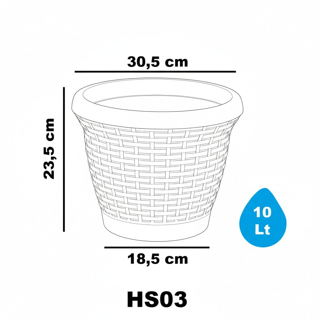 Teknik bilgi: Ölçü ve hacim değerleri varyantHASIR SAKSI 3 NO - Antrasit: Serinova üretimi saksı varyantıdır. Teknik: Ölçü: 305X235 mm | Hacim: 10 L | Koli içi adet: 20 Not: Ölçü ve hacim değerleri üretici datasına göre listelenmiştir.
