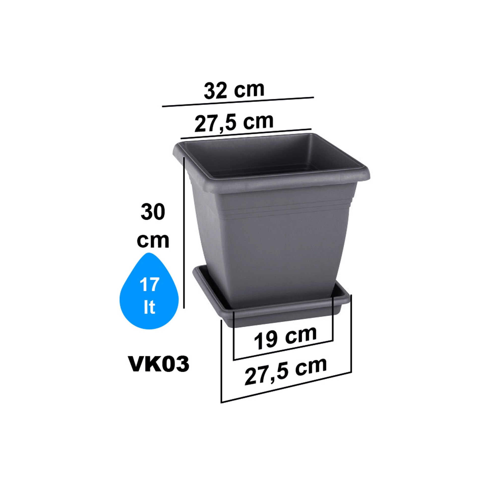 Teknik bilgi: Ölçü ve hacim değerleri varyanta göre dVİLLA KARE SAKSI 3 NO - Antrasit: Serinova üretimi saksı varyantıdır.